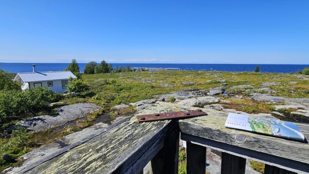 Maisemaa tornista kohti luodetta. Kaiteella on laivalta mukaan saatu Tankarin esite, johon luontopolku ja saaren kohteet oli kivasti merkitty.